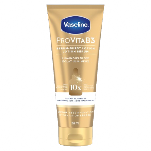 La lotion sérum Vaseline Éclat Lumineux Pro VitaB3 est une avancée en beauté et en science de la peau. Notre sensation de lotion en sérum offre une hydratation légère toute la journée qui n’est jamais grasse. Enrichie en vitamine B3 (niacinamide), acide hyaluronique, lipides ultra-hydratants et vitamine E ; cette formulation revitalise la peau terne et aide à maintenir l’hydratation équilibrée de la peau. Cette formule contient un complexe antioxydant qui offre 10 fois plus de pouvoir antioxydant que la vitamine C, donnant à votre peau un éclat d’aspect sain et hydraté.